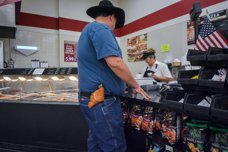 Lee Bird carries his .38-caliber pistol on his hip everywhere he goes. That includes his local grocery store in Wickenburg, Ariz. Photo by Jacob Byk/News21.