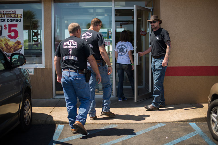 On their way to a community event, Citizens Militia of Mississippi members, from left, Mark Glidewell, Robert Mitchell, Doug Jones, and Jones’ daughter Raven, center, stop for lunch at Hardee’s. Photo by Jim Tuttle/News21.