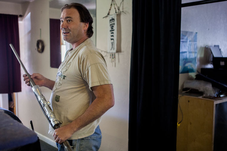Bill Long handles one of the guns, a .300-caliber magnum rifle, he keeps at his home in Nucla, Colo., on June 17, 2014. Long was the only Town Board member to vote against the “Family Protection Order,” an ordinance that mandates gun ownership among the less than 700 residents. Photo by Morgan Spiehs/News21.