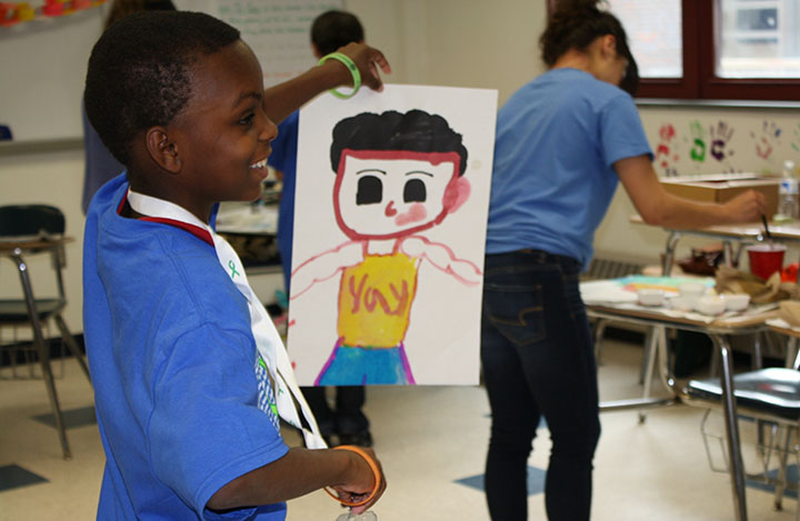 Ten-year-old Carmello Roberts, who lives in Hartford, holds up a painting during a workshop led by a Newtown Middle School art teacher. (Photo by Sarah Ferris/News21)