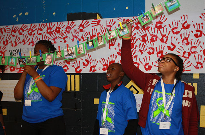 Students display the names and stories of dozens of gun violence victims to show during the daylong Youth Leadership Summit. (Photo by Sarah Ferris/News21)