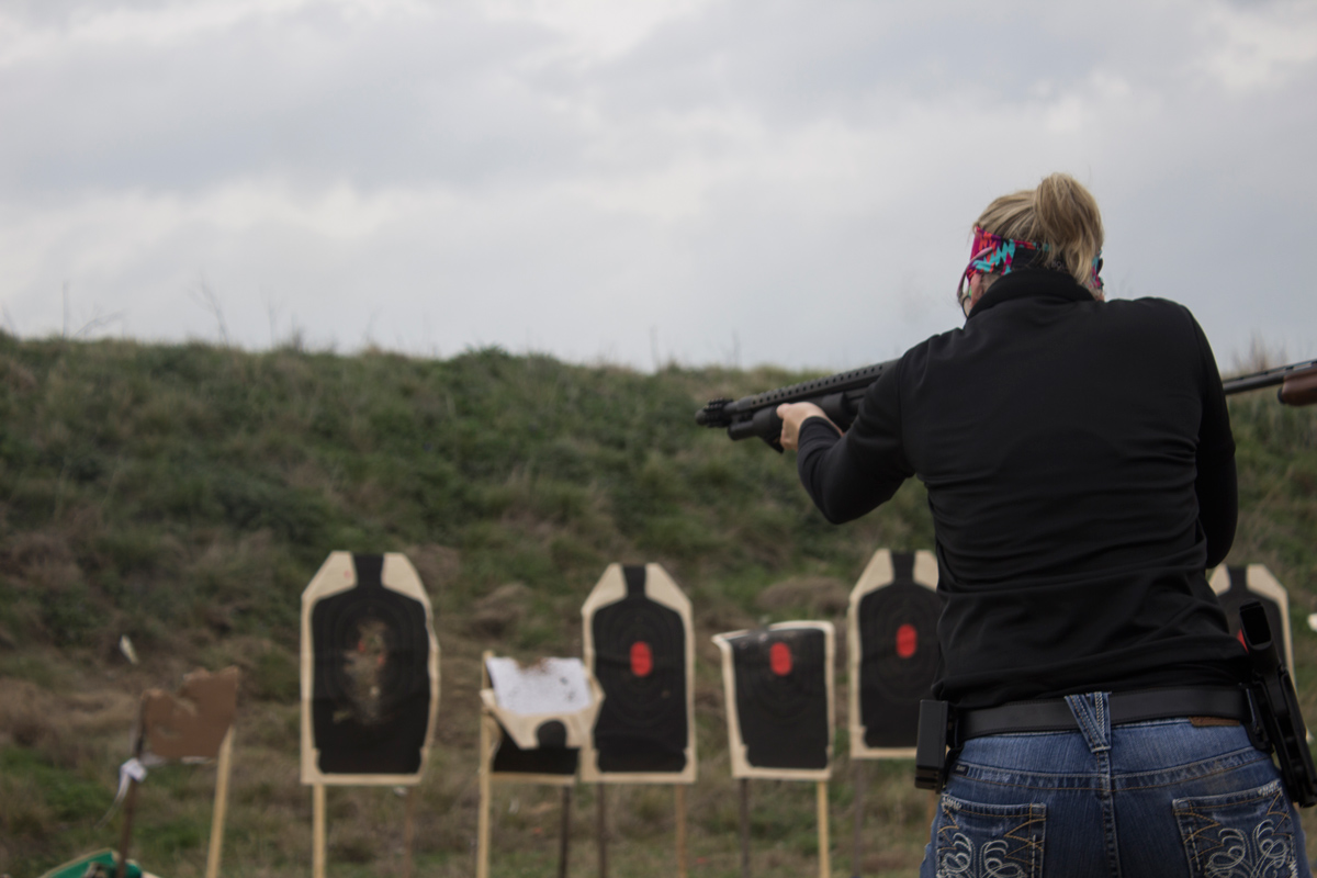 Ginger Peacock, who founded the Marietta, Ga. A Girl and A Gun chapter, takes aim during a shotgun home defense class at the T.I.G.E.R Valley outdoor range in Waco, Texas.