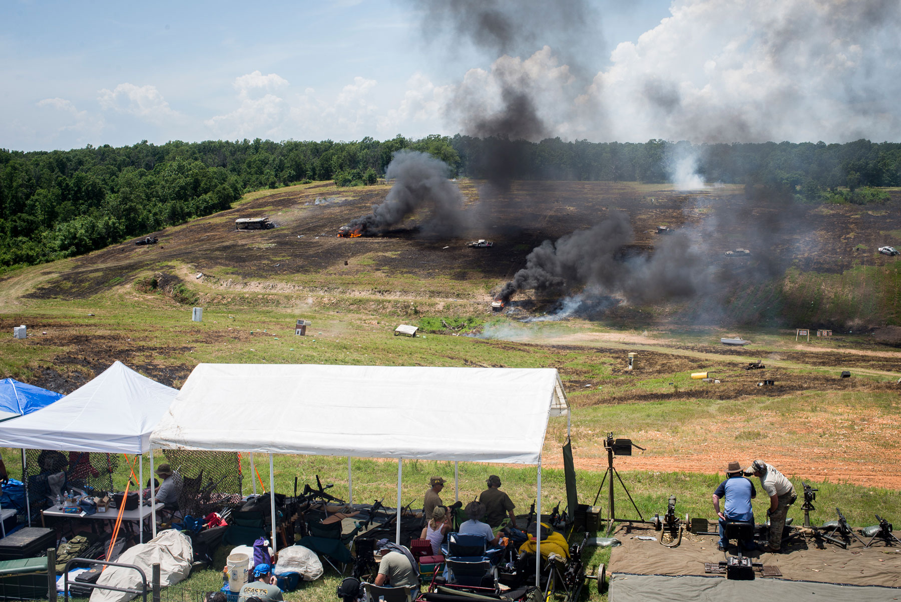 Their targets included a range full of old appliances, televisions, boats and a school bus packed with explosives. One of the weekend’s highlights was called “kill the car,” in which a sniper’s bullet set a car rolling downhill and dozens of people opened fire until the vehicle was consumed by a huge fireball.