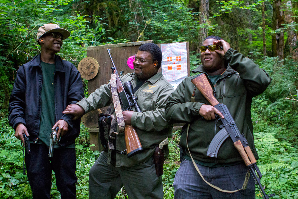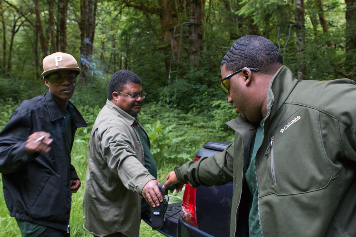 Donny Adair, center, the founder and president of the African American Hunting Association, and his sons Kenneth, left, and Donnell, right, prepare to target shoot in the forest of the Coast Mountain Range near Scappoose, Ore., on June 17, 2014. Photo by Sam Stites/News21.