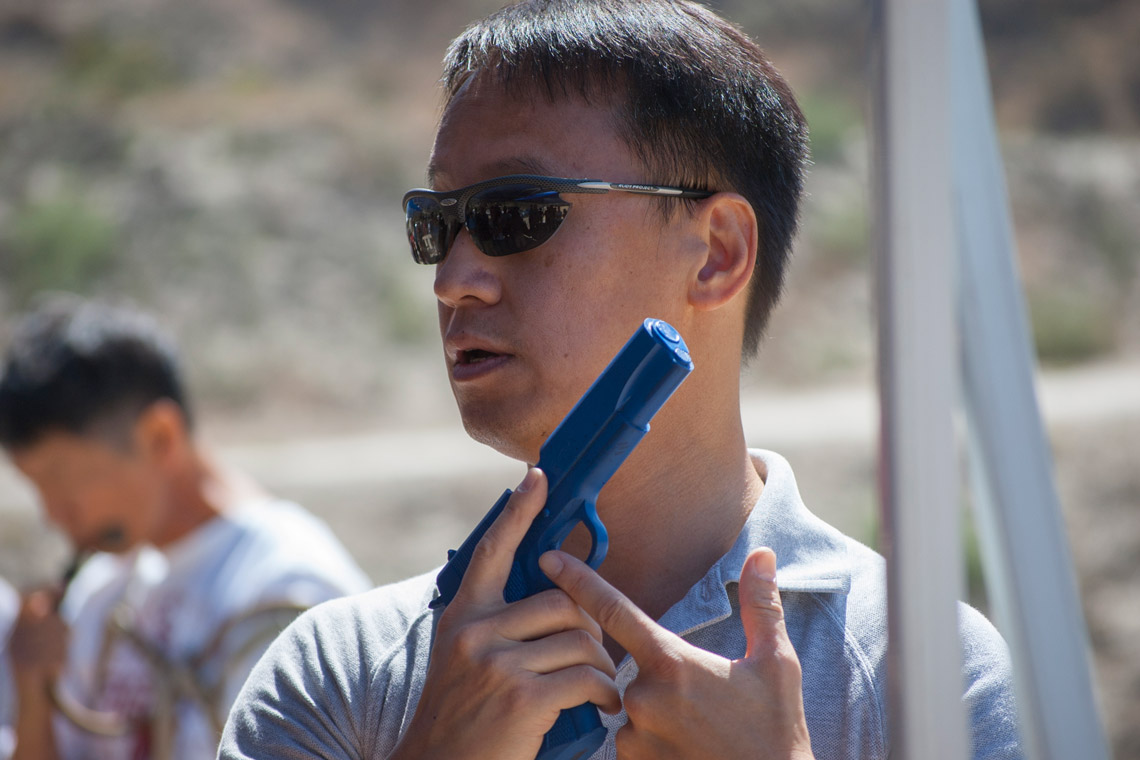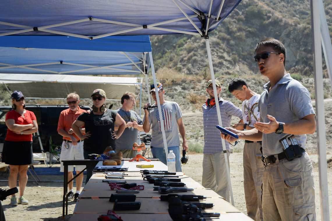 Alex Tham, director of the American Marksman Training Group, teaches gun safety to a group of students at an open range day hosted by his firearms training school June 28, 2014. Tham's small company based in southern California teaches novice shooters how to enjoy using firearms, he said. Photo by Kristen Hwang/News21.