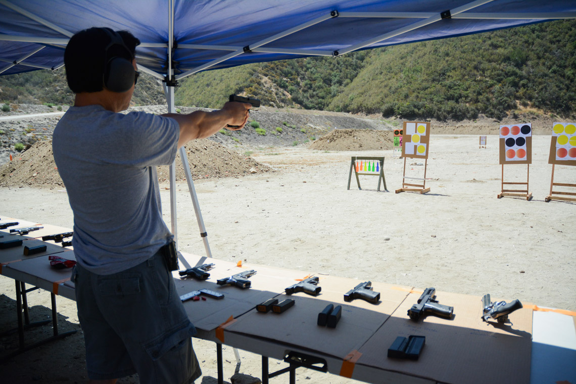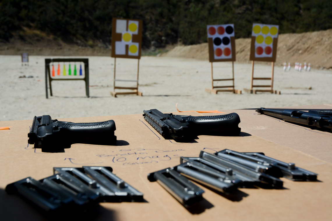 Participants in the open range day gather at the Burro Canyon Shooting Park in the Angeles National Forest in southern California. Instructors from the American Marksman Training Group taught participants how to handle firearms safely. Photo by Kristen Hwang/News21.