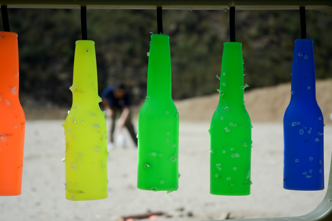 A firearms instructor sets up targets at the Burro Canyon Shooting Park in southern California. Participants practiced their marksmanship on bowling pins, zombie posters, plastic bottles and clay pigeons. Photo by Kristen Hwang/News21.