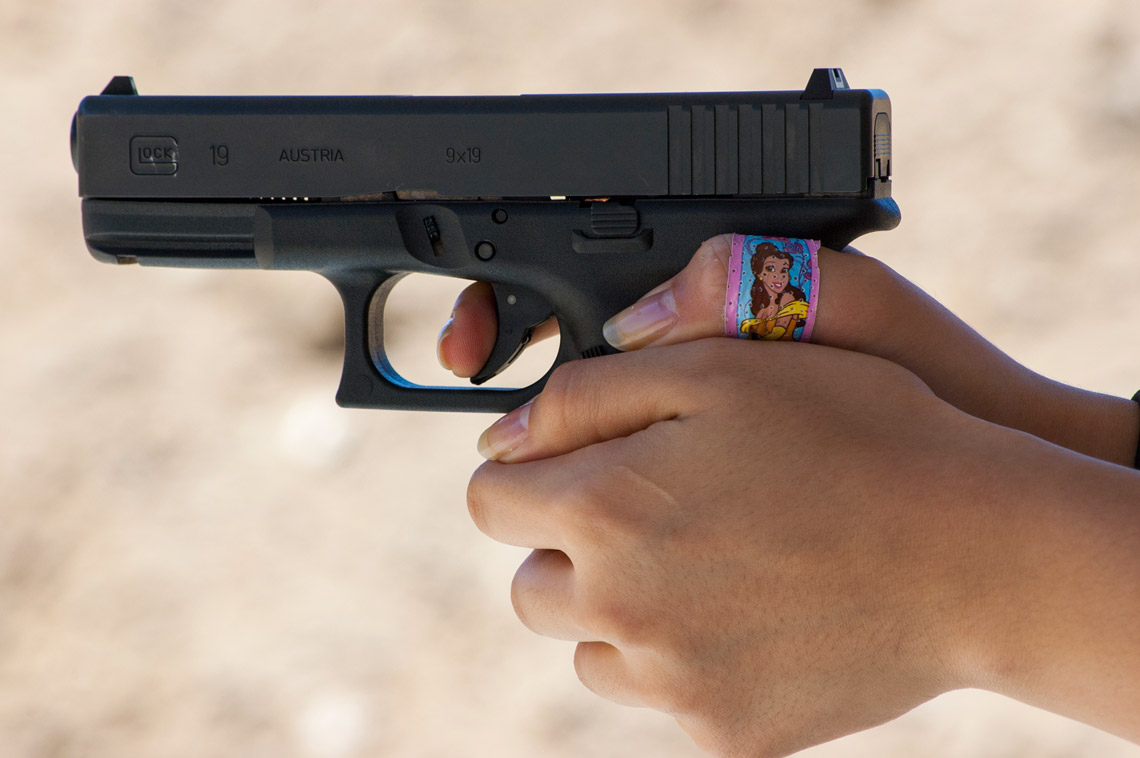 Ellie Lim points a Glock 19 handgun at a paper target during the American Marksman Training Group open range day. She lines up the sights before pulling the trigger. Photo by Kristen Hwang/News21.