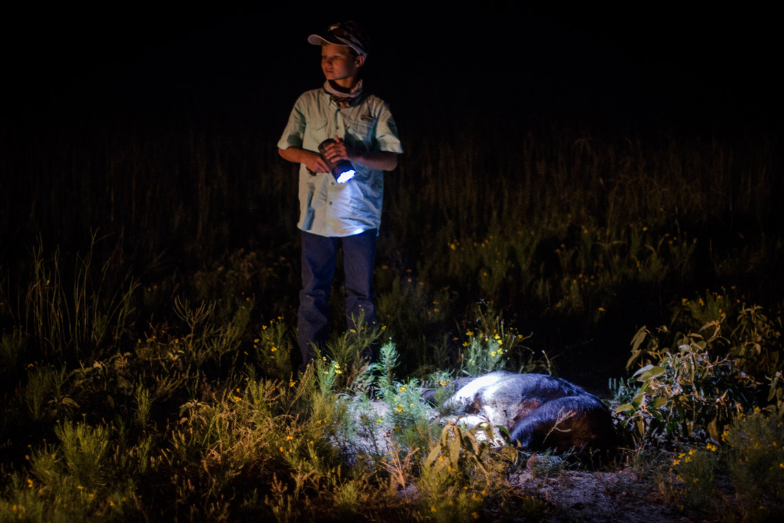 Miguel shot a pig shortly after nightfall on one of his last days at camp. He had missed a few hours earlier and was about to quit for the night when this animal wandered into the clearing in front of his blind. Garay called the kill “sweet redemption.” Photo by Jim Tuttle/News21.
