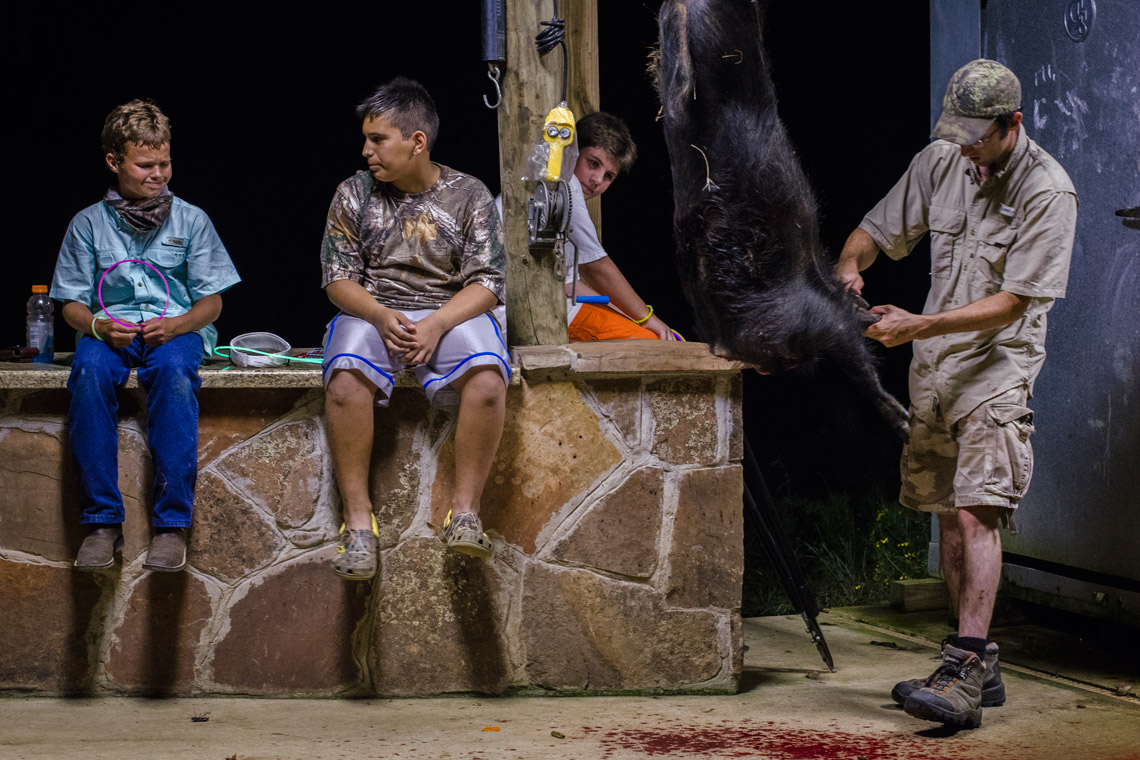 After bringing the dead pig back to camp, Garay skins it as Miguel and two fellow campers, from left, Cristian Salinas and Tristan Hardin, look on. The kids take home some of the meat they harvest; some of it is kept to feed future camps. Miguel said he planned to have the pig’s head mounted as a trophy. Photo by Jim Tuttle/News21.