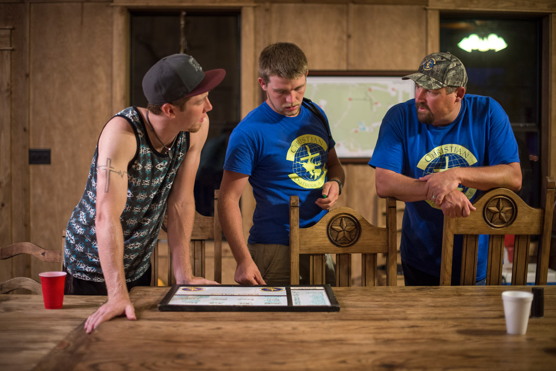 From left, counselors Jarrett Hall, left, and Clint Parkhill discuss the next day’s hunting plans with Michael Marbach, the Christian Outdoor Alliance’s founder and executive director. Photo by Jim Tuttle/News21.