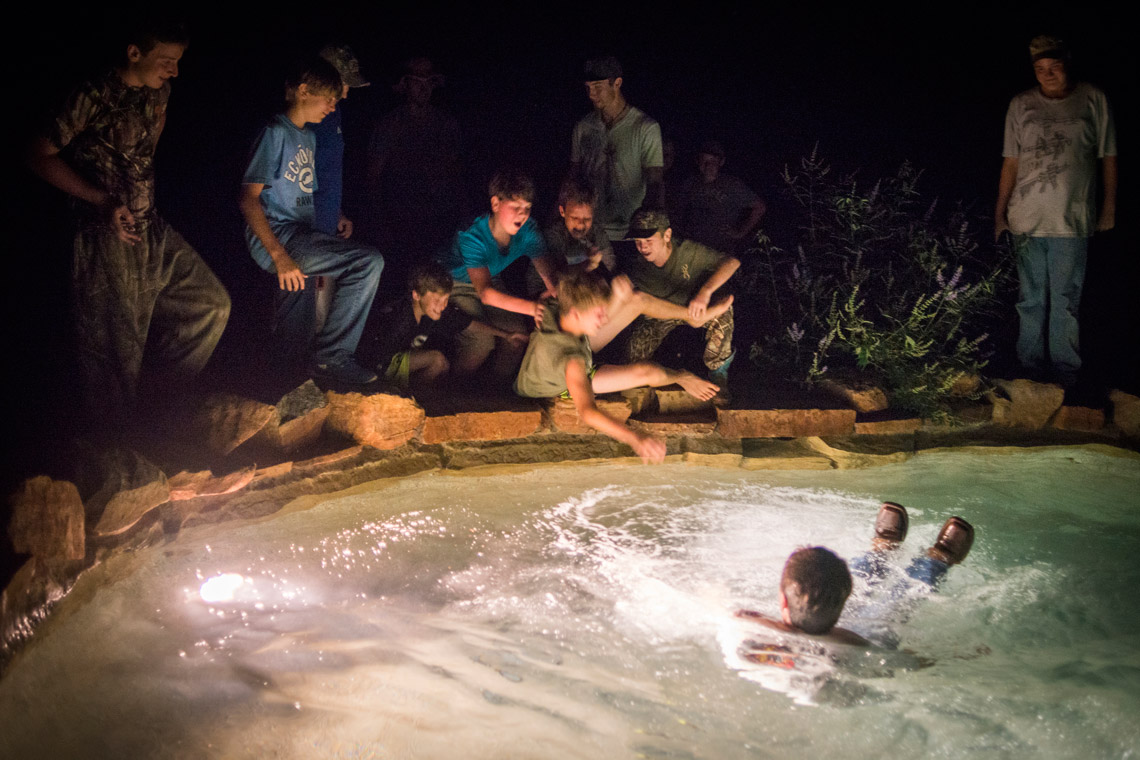 Campers celebrate a week of successful hunting at one of the Mobley Ranch’s swimming pools. Photo by Jim Tuttle/News21.