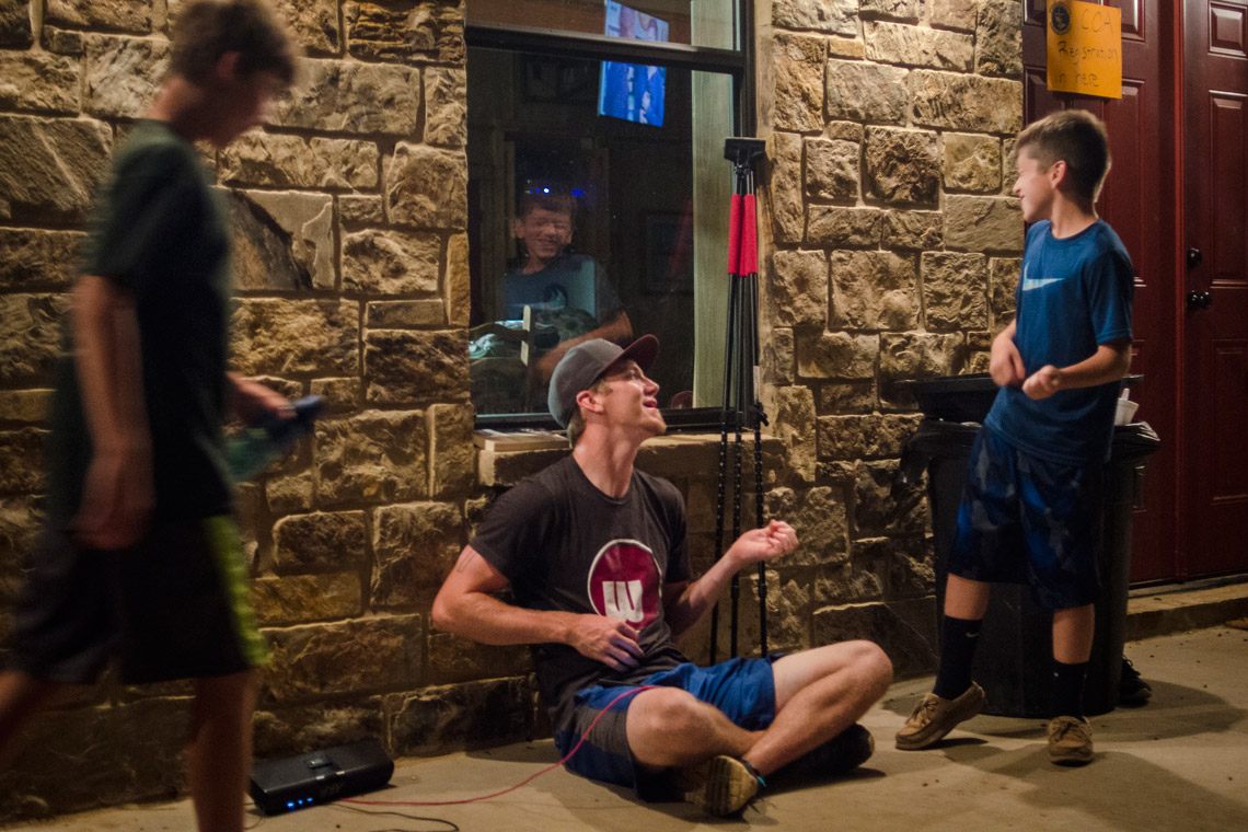 Counselor Jarrett Hall plays air guitar with camper Cody Lindholm. Hall is a college student and started working at the Christian Outdoor Alliance in 2014. He plays in a Christian rock band and hopes to make a career in Christian music. Photo by Jim Tuttle/News21.