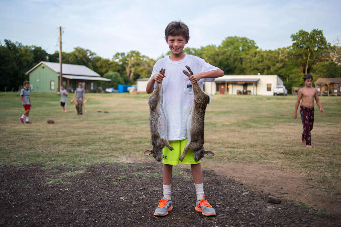 Once every camper had killed a pig, ram or deer, the counselors took them to hunt small game. Drew West poses outside the lodge with two rabbits he shot. Photo by Jim Tuttle/News21.