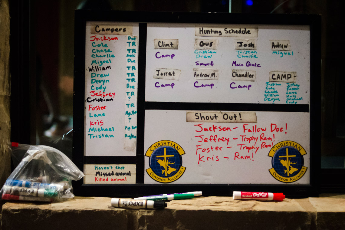Counselors use a whiteboard to plan each day’s hunt and to keep track of the campers who have killed an animal during the week. Photo by Jim Tuttle/News21.