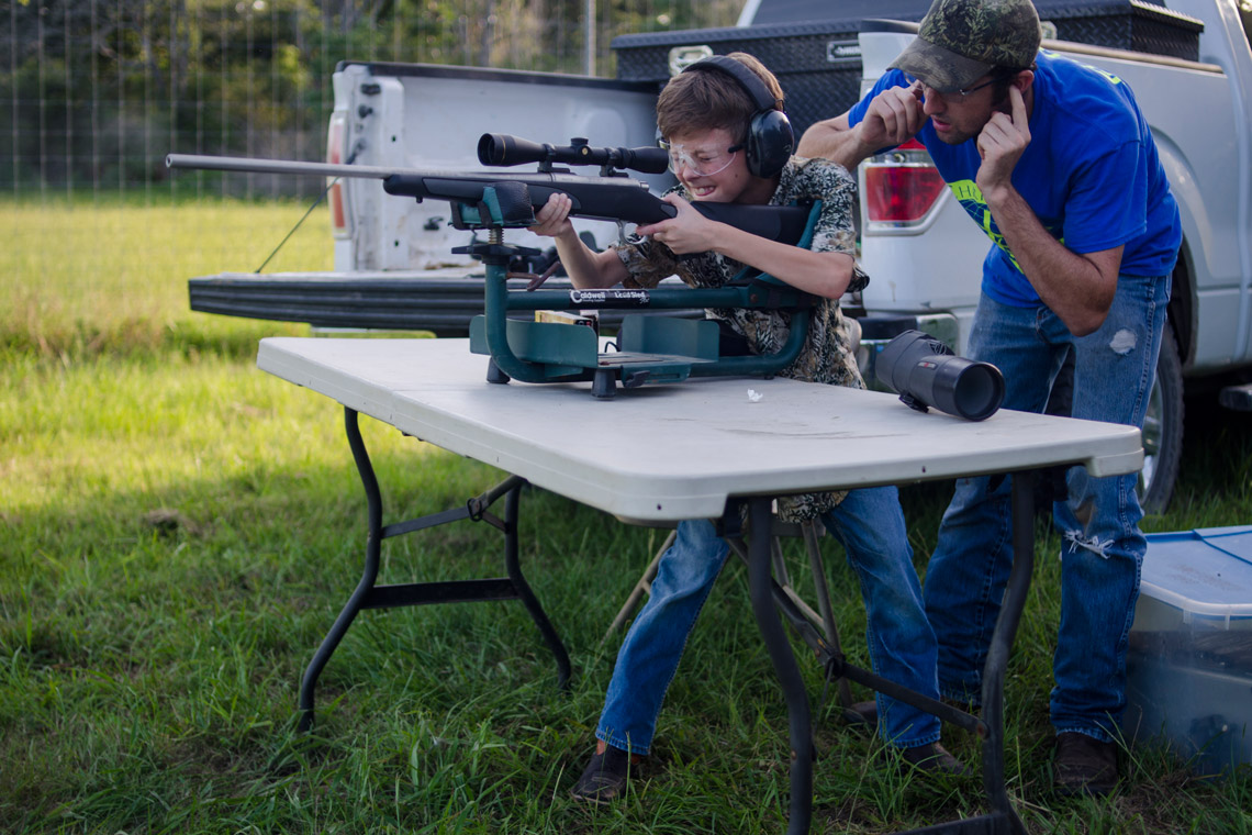 Camper Drew West sights in his rifle with help from counselor Andrew Garay. Photo by Jim Tuttle/News21.