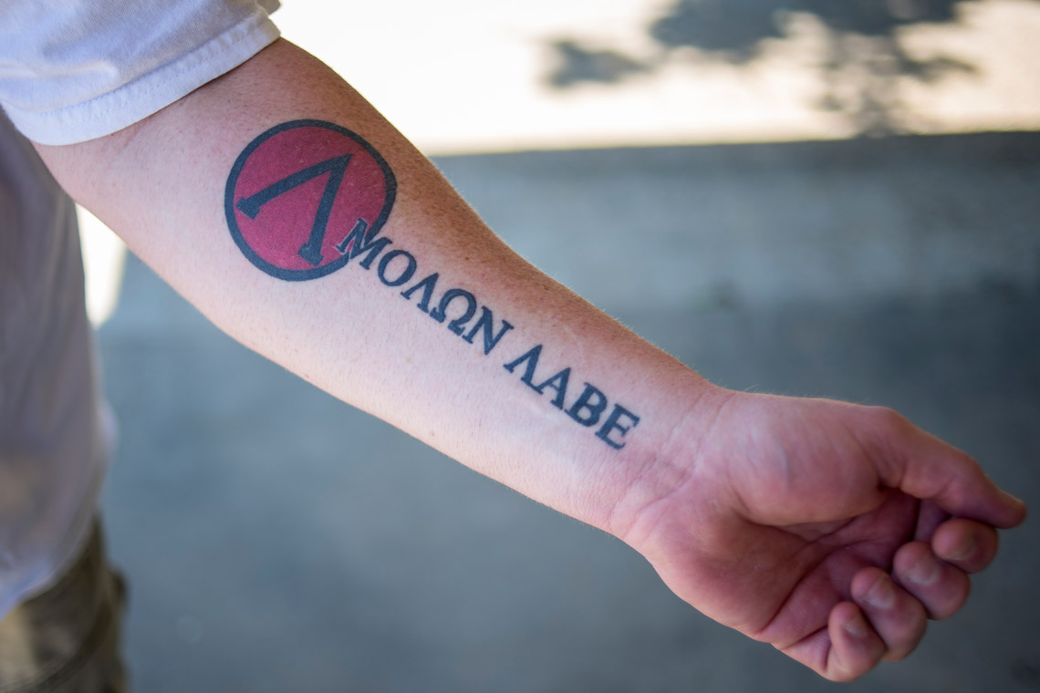 Kevan Owen, of the Citizens Militia of Mississippi’s northeast chapter, has a tattoo of a Greek phrase on his forearm. "Molon Labe," or "Come and take them," is a rallying cry in the militia movement. Photo by Jim Tuttle/News21.