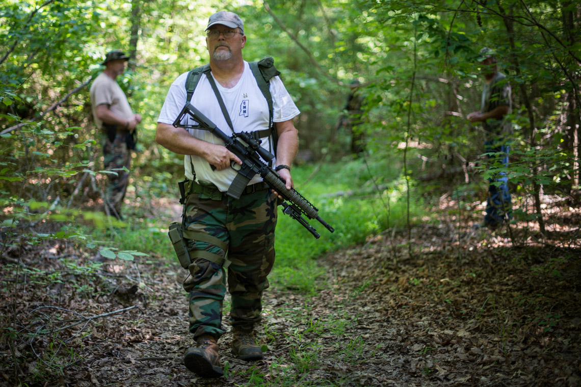 Active militia members participate in training exercises once a month. Tate County chapter Cmdr. Billy May carries an AR-15 during a patrol drill in Batesville, Miss. Photo by Jim Tuttle/News21.