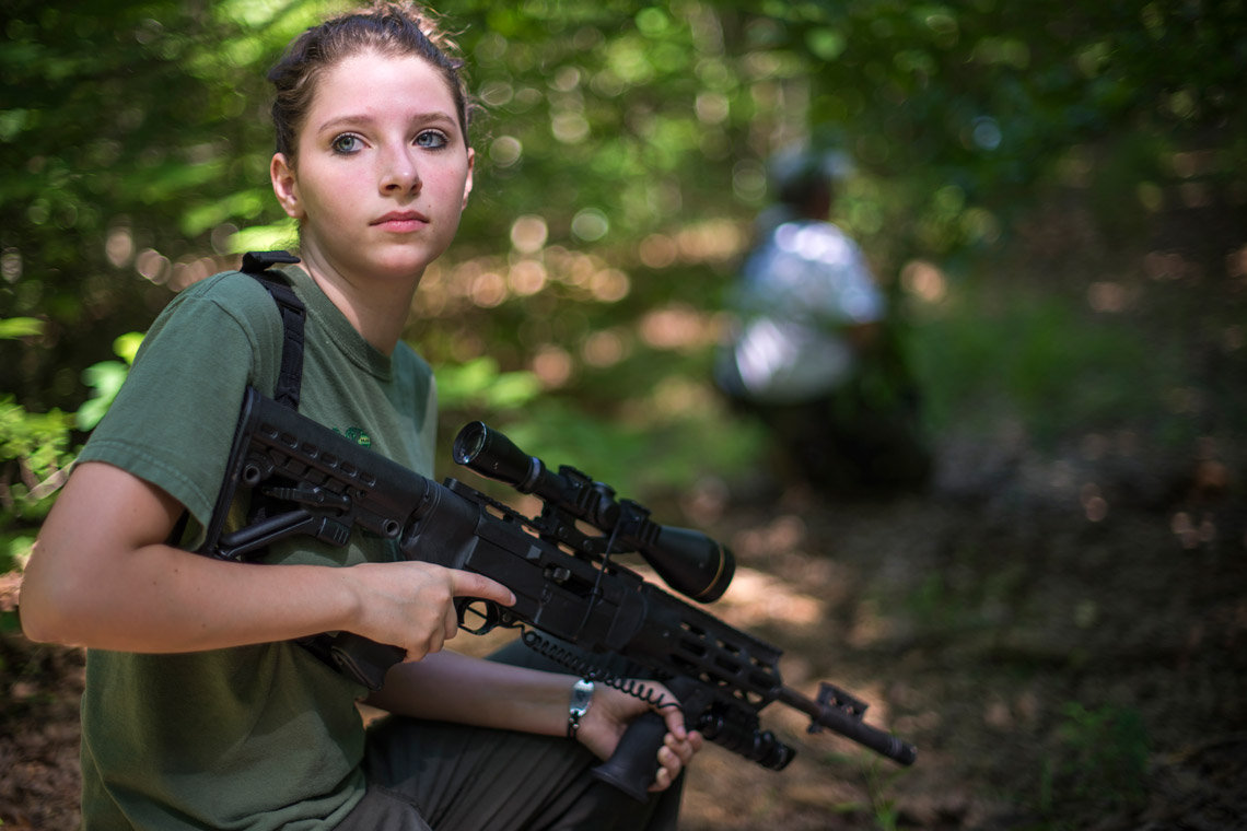 Raven Jones,16, crouches with an AR-15 during a Citizens Militia of Mississippi patrol drill. Her parents, Kim and Doug Jones, are founding members of the group. Photo by Jim Tuttle/News21.