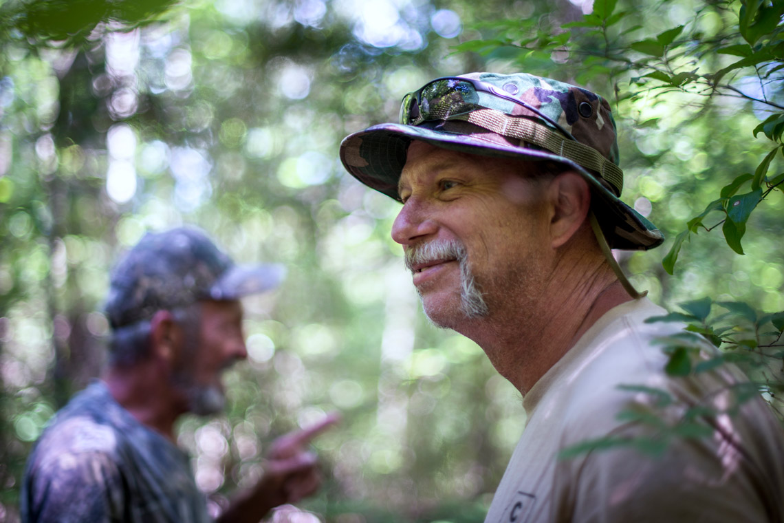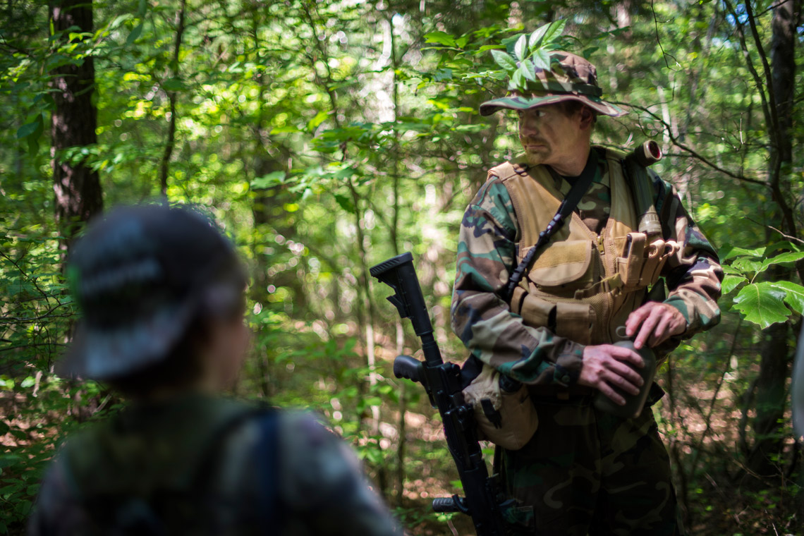 Militia members practice advancing through the woods and to spot Brandy Davis, right, posing as an enemy combatant. His 10-year-old son, Dalton Davis, left, also participated in the patrol drill. Photo by Jim Tuttle/News21.