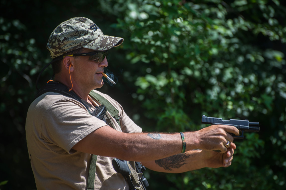 Dale Drewery, a militia member from Itawamba County, Miss., fires a Glock handgun during target practice near Booneville, Miss. The group requires applicants to pass a background check so as not to give felons access to to firearms. Photo by Jim Tuttle/News21.
