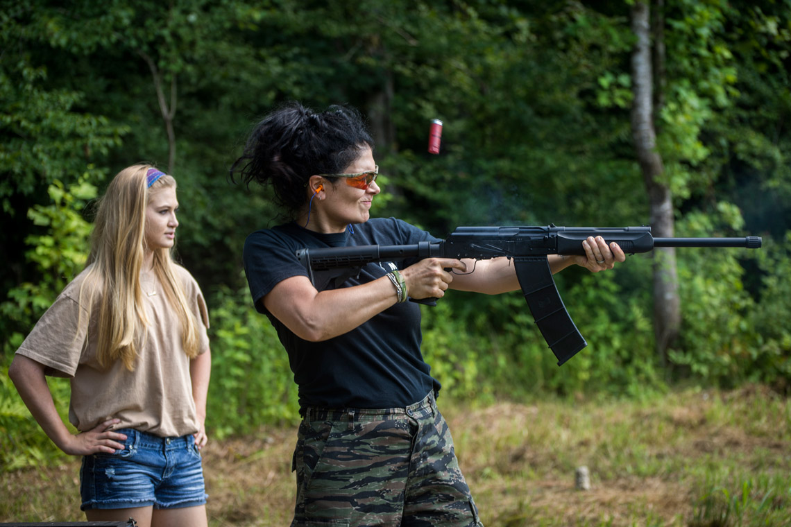 Kimberly Jones fires a semi-automatic tactical shotgun as junior member Lexie Muse, 14, looks on. Photo by Jim Tuttle/News21.