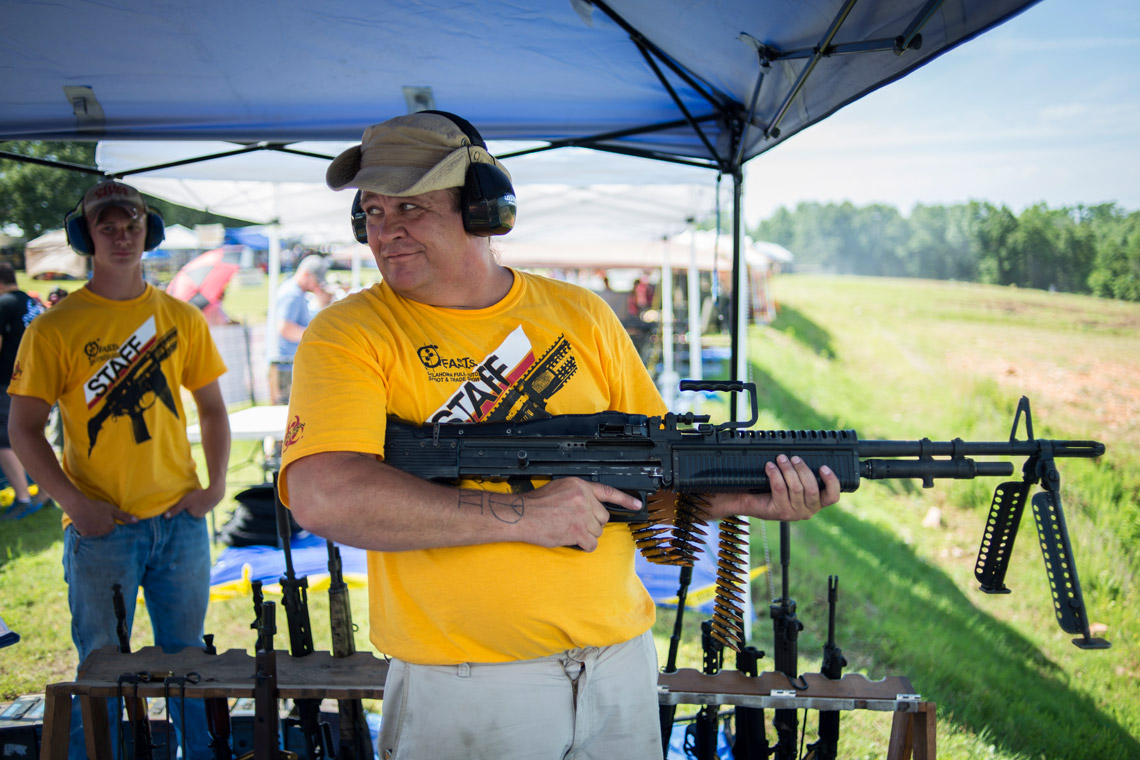 Kendall Beaver, a gunsmith for Firing Line, shoots a fully automatic M60 rifle during the Oklahoma Full Auto Shoot & Trade Show in Wyandotte, Okla. Photo by Jim Tuttle/News21.