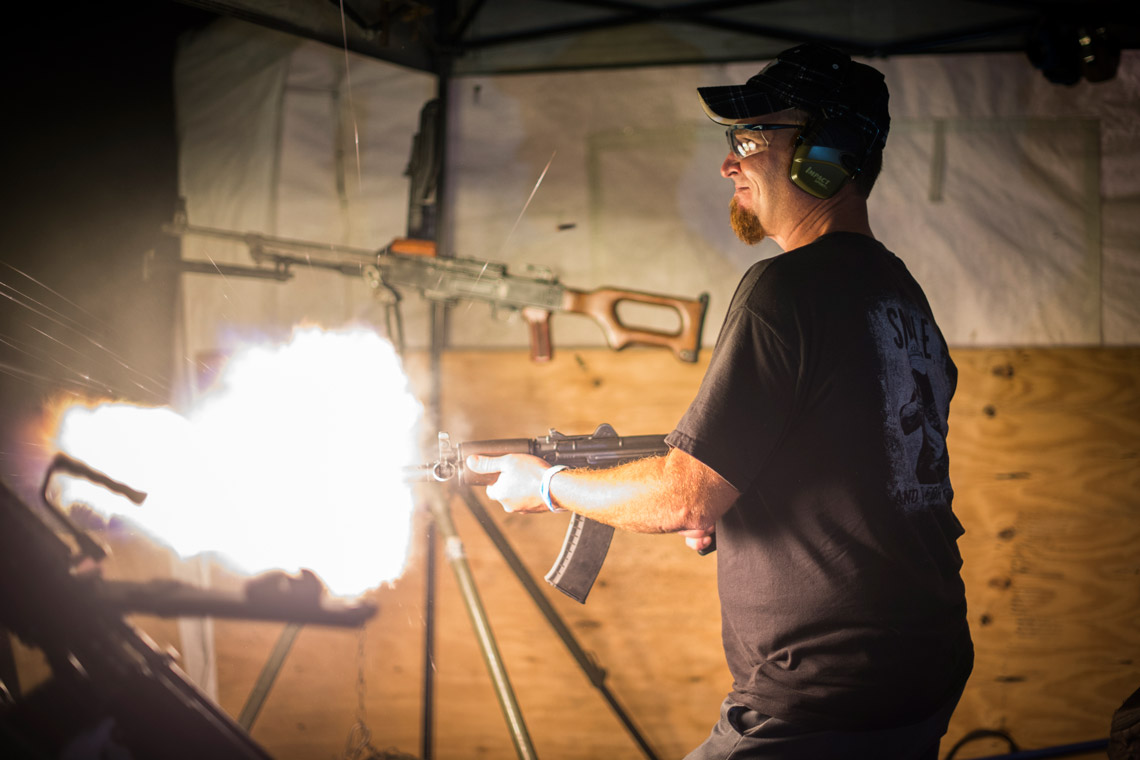 After a full day of shooting, machine gun fire lit up the night with tracer rounds and fireballs. Waco Tomlinson, of Mustang, Okla., fires one of the weapons rented at Jerry's Machine Guns. Photo by Jim Tuttle/News21.