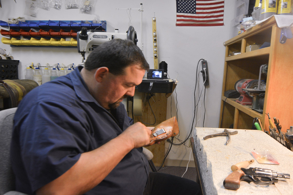 Bird finishes drawing the outline of a custom holster for a customer, whose gun sits on the table beside him. Photo by Jacob Byk/News21.