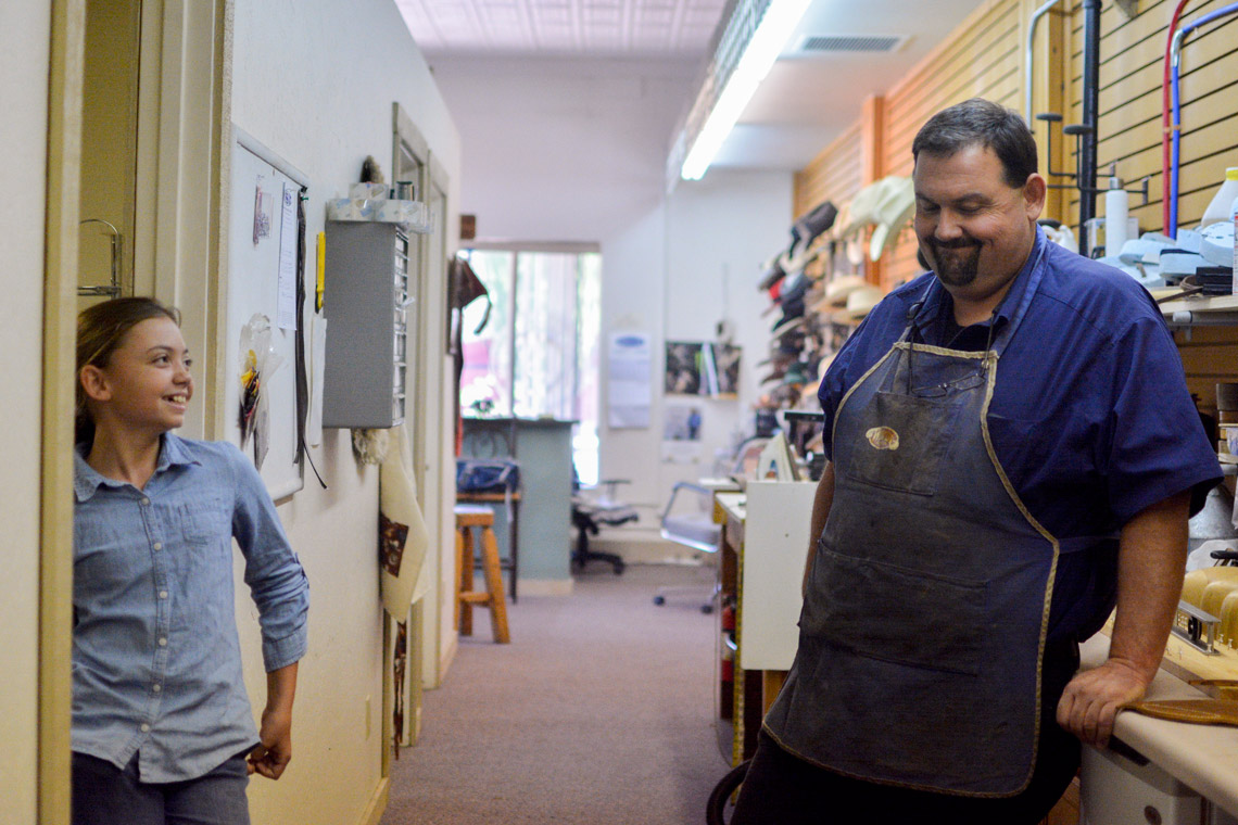 Bird laughs with his 12-year-old daughter Emily as he closes Twin Birds Saddlery, his Wickenburg, Ariz., store. Photo by Jacob Byk/News21.