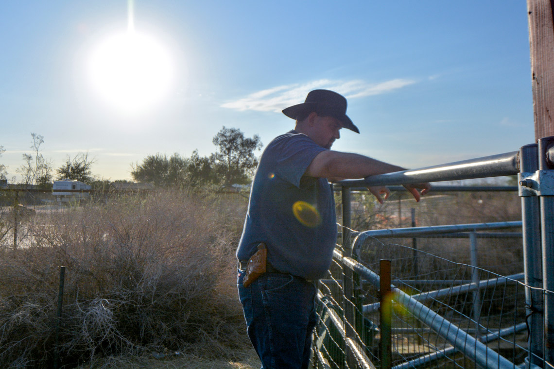 Bird feeds animals at his desert home in Surprise, Ariz. He often uses his rifle to scare off coyotes that try to attack his horses. Photo by Jacob Byk/News21.