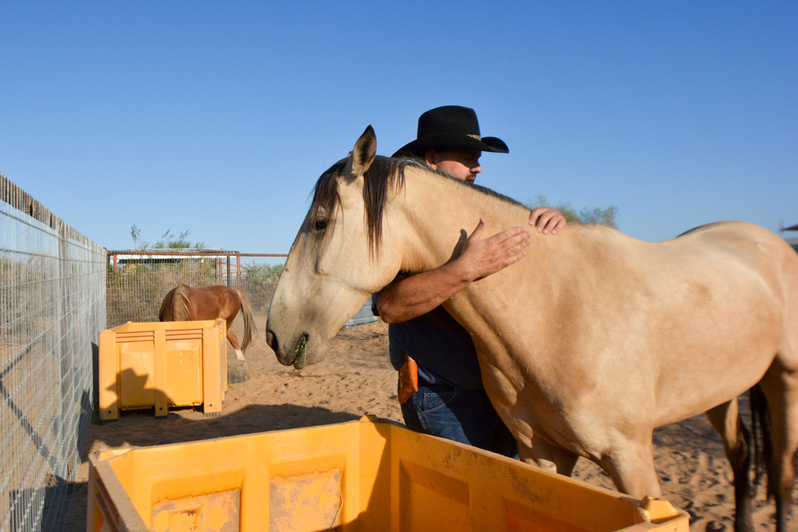 Bird embraces his daughter's horse at his Arizona home. He picked his .38-caliber revolver as his go-to firearm because it will not fire if he falls off or is thrown from one of his animals. Photo by Jacob Byk/News21.