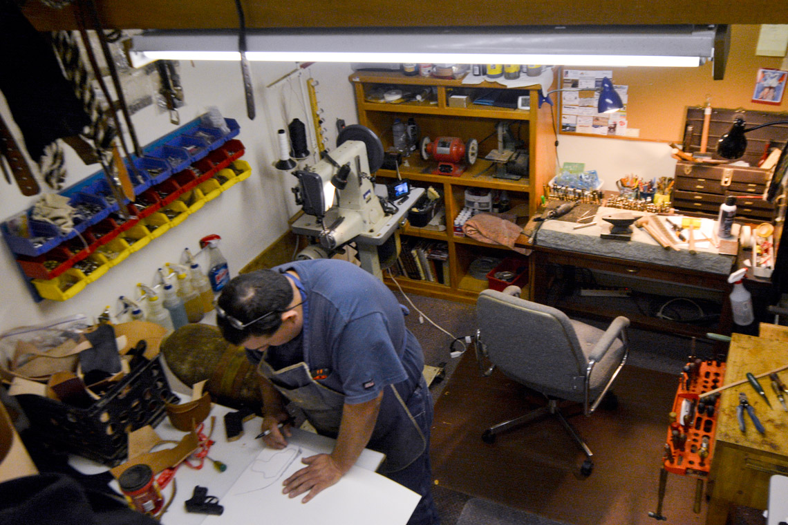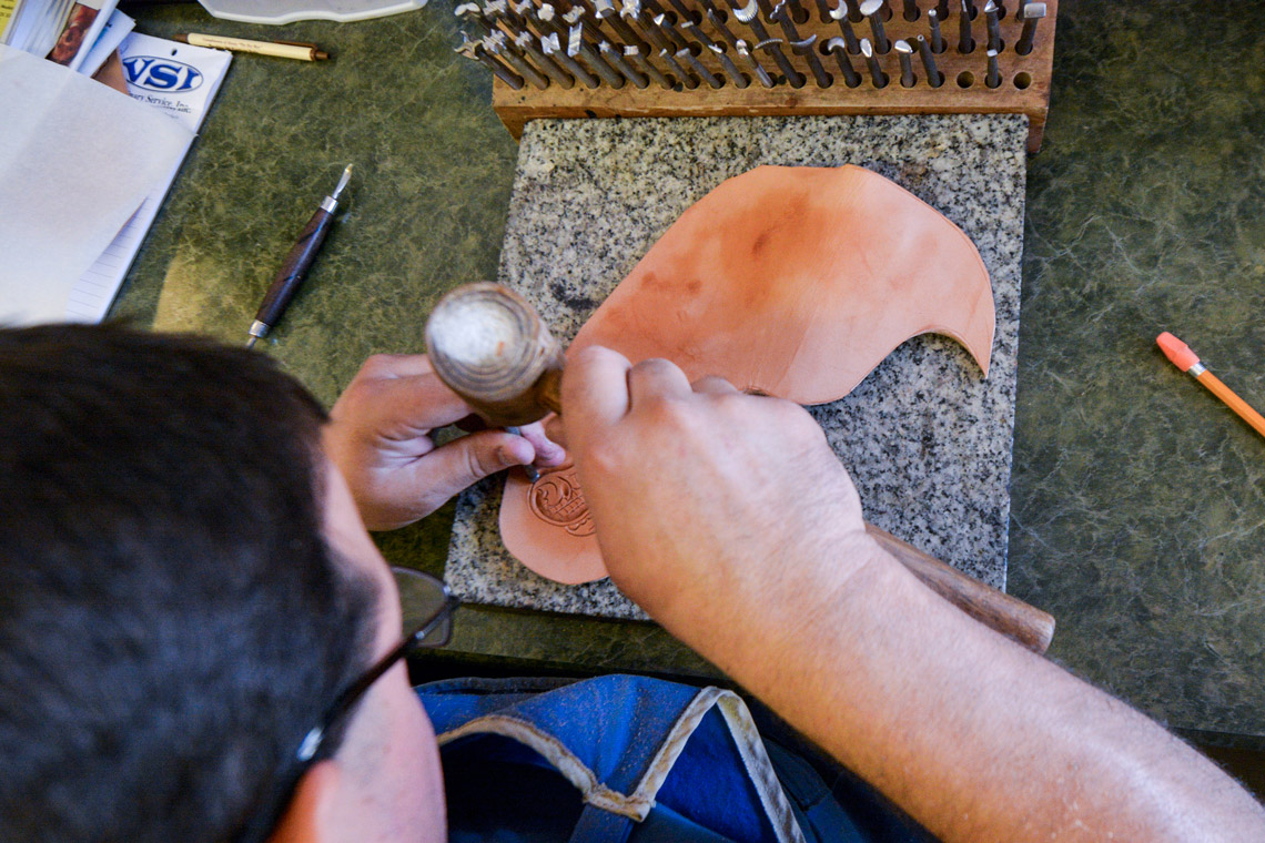 Using a mallet and symbol tools to design patterns, Bird creates decorative prints on the leather after sizing it for the gun. Photo by Jacob Byk/News21.