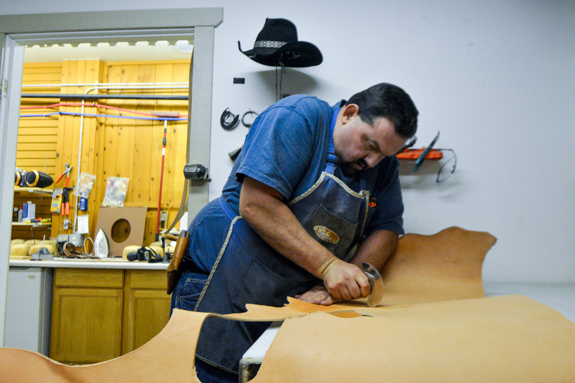 Bird slices rawhide to get an exact mold of the gun whose holster he is making. The material sits on the counter, swirled into a tube. Photo by Jacob Byk/News21.