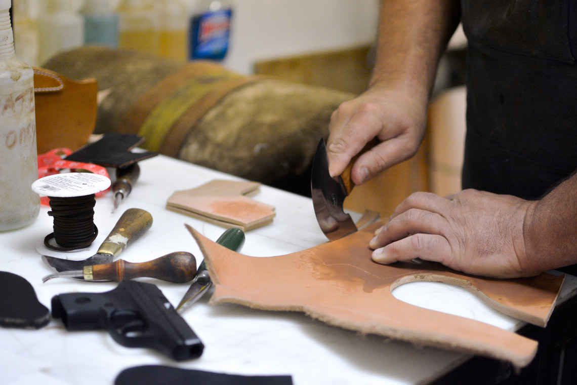 Bird uses sharp blades to parcel sections of his holsters and traces the customer's firearm. Photo by Jacob Byk/News21.
