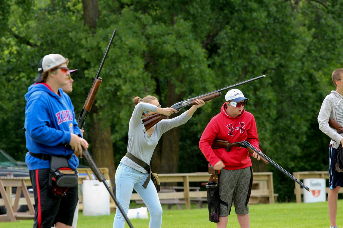 Wayzata trapshooting team members, from left, Andrew Rhodes, Max Bunning, Kerri Mueller, and Connor Czech practice at Park Sportsmens Club as Connor’s father, Mark, looks on. An influx of high school trapshooters revived the struggling gun clubs in Minnesota. "It just means that we know that the sport will live on and that it won't be a smaller sport," Mueller said of the increase in young shooters. Photo by Jessica Boehm/News21.