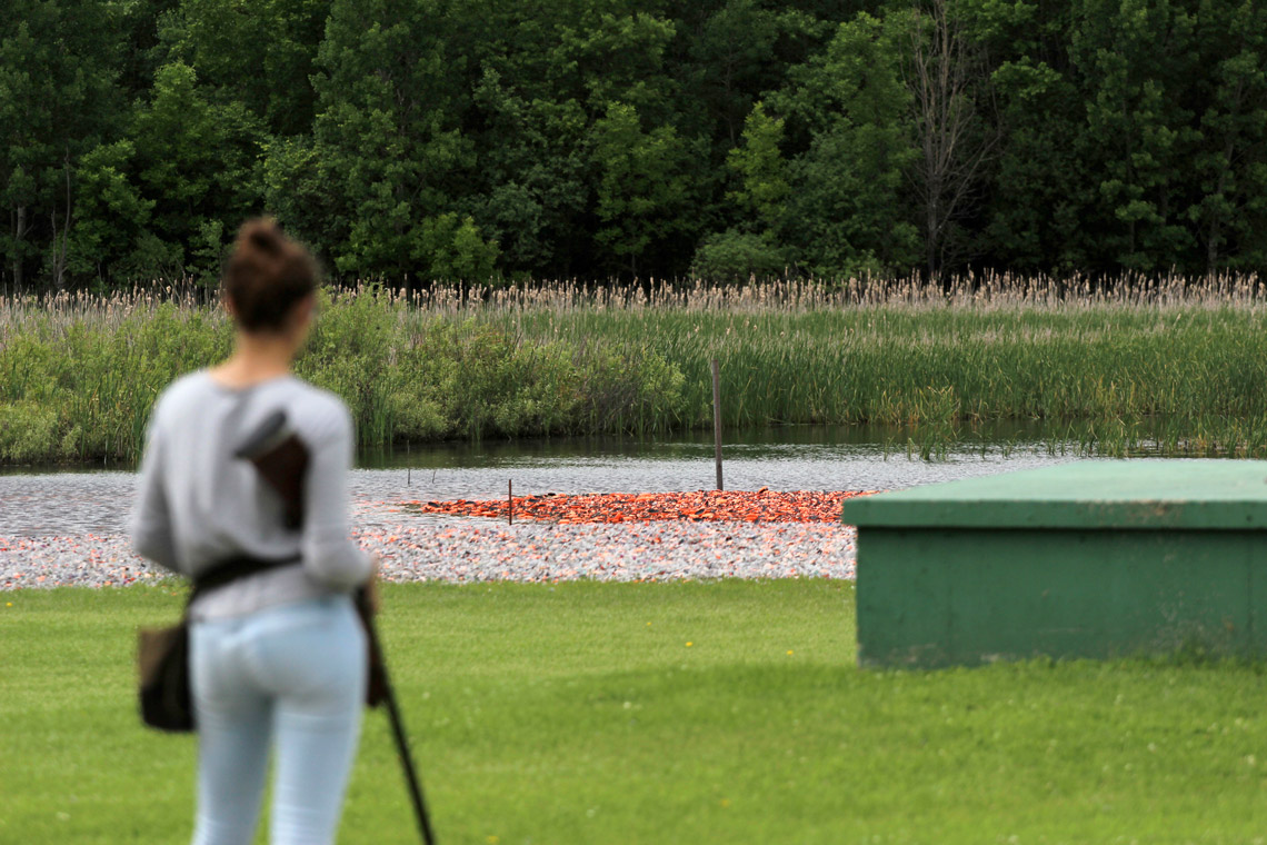 Mueller looks out at the pieces of orange clay targets at the Park Sportsmens Club during trapshooting practice. "It's mostly a mental game, so you just need to stay focused and not get too distracted," she said. Photo by Jessica Boehm/News21.
