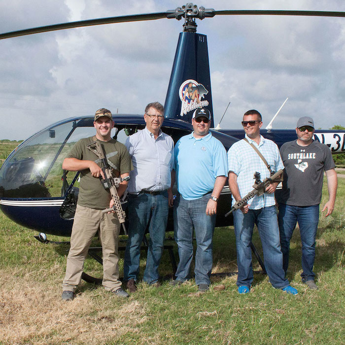 Hunters go to Bay City, Texas, to hunt from a helicopter, using high-powered rifles to kill wild hogs that damage farms.